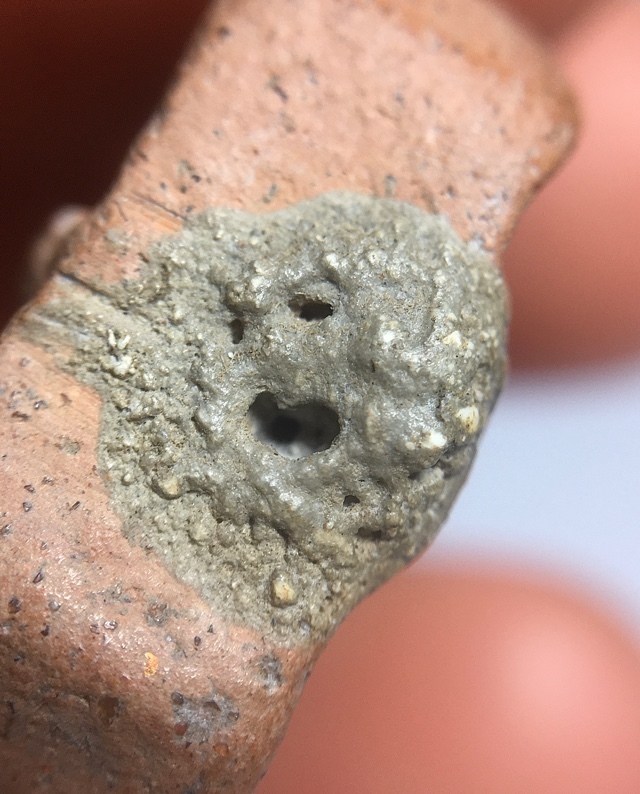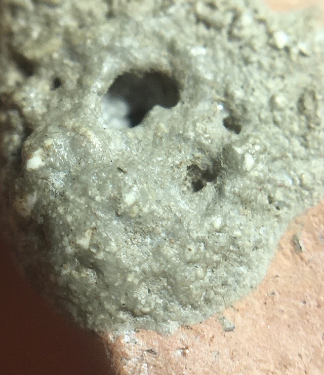 7. The Pong Wised Muan Sarn Sacred Powders stuffed into the top cavity are so hardened with age as to be hard as concrete,due to over a century of aging in natural atmospheric conditions. This natural uneven petrification and hardening, and contraction of the Pong Wised Muan Sarn Sacred Powders is impossible to fake, and is a true revelatory characteristic of authenticity in an amulet